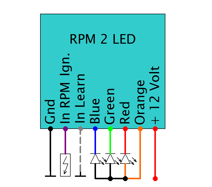 Die 3 Umschaltpunkte können dabei sehr einfach vom Benutzer eingestellt werden. Hierfür wird das graue Kabel gegen Masse gehalten und dann die Strommversorgung vom Modul eingeschaltet. Wenn das grüne Kabel jetzt wieder von Masse abgenommen wird, dann blinkt das Modul erst blau auf und zählt die Drehzahl jedes Mal um 500 RPM hoch. Wenn der erste Umschaltwert erreicht wurde, wird das Kabel kurz gegen Masse gehalten. Jetzt blinkt die LED grün und das Modul zählt bei jedem Blinken wieder um 500 RPM hoch. Sobald das Kabel dann nochmal gegen Masse gehallten wird, blinkt das Modul in gelb und zählt die Umdrehhungen weiter hoch. Bei einem weiteren Berühren des grauen Kabels blinkt die LED kurz rot auf und speichert die Werte. Danach kann das graue Kabel isoliert werden und das RPM 2 LED ist einsatzbereit.